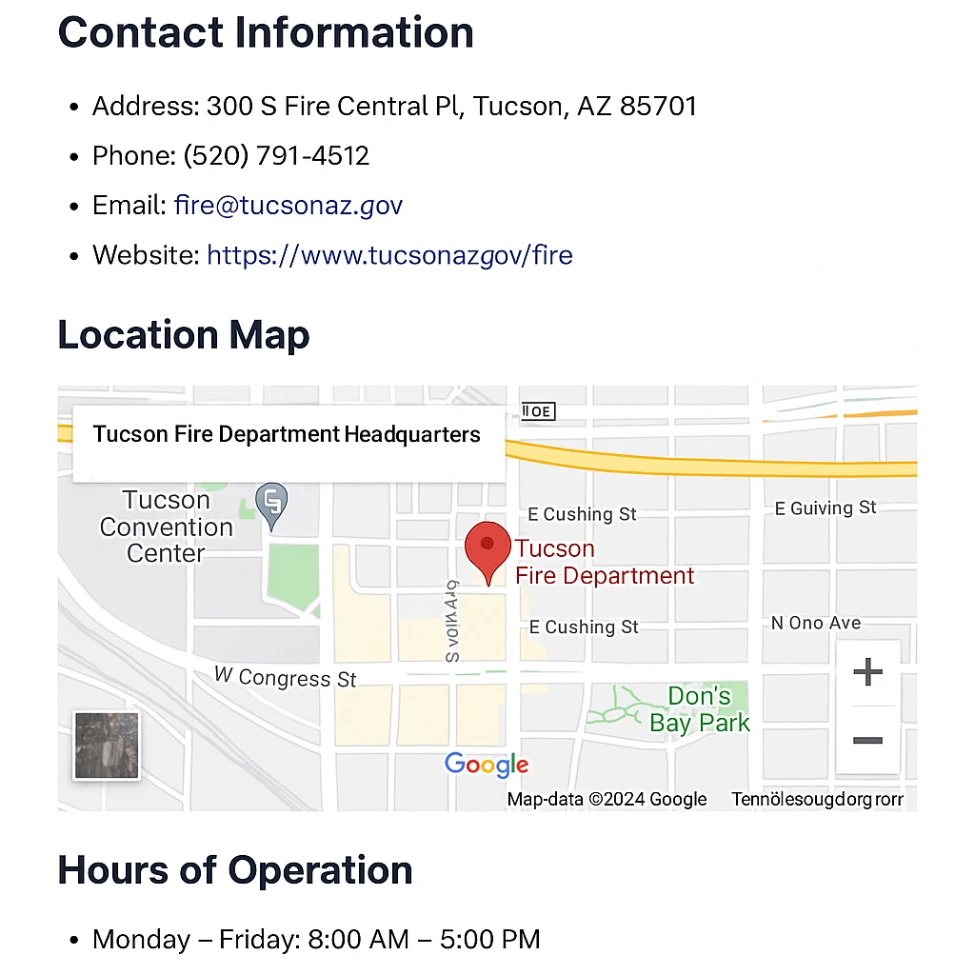 Headquarters Address: 300 S Fire Central Pl, Tucson, AZ 85701 Phone: (520) 791-7482 Email: fire@tucsonaz.gov Website: tucsonaz.gov/fire